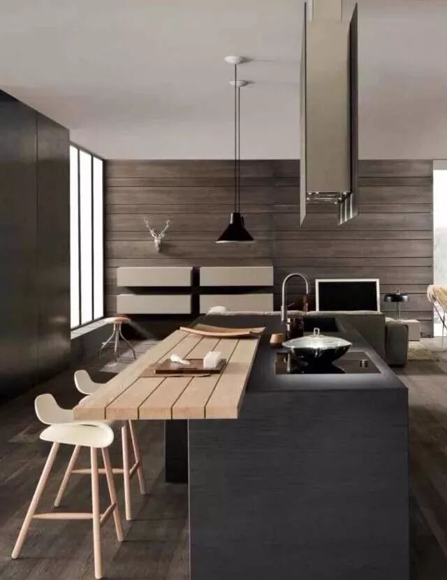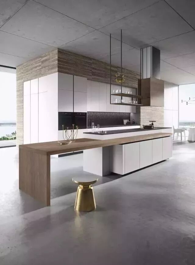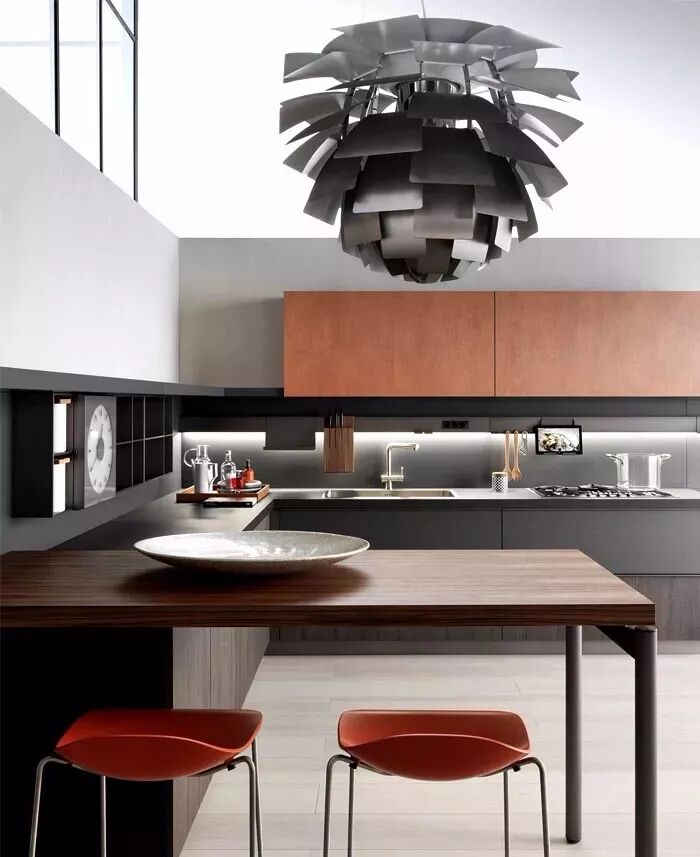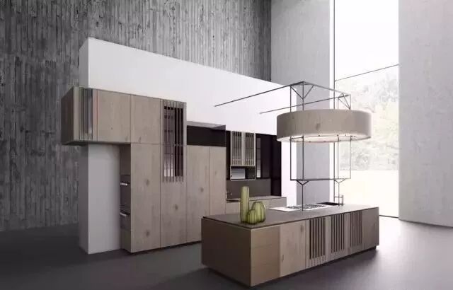 吊顶的设计源于最初的岛式工作台,通常在这上面会设置工作台的照明系统和排油烟系统。新型的吊顶不仅仅是这些设备的载体,更是成为了一种全新的装饰方式。