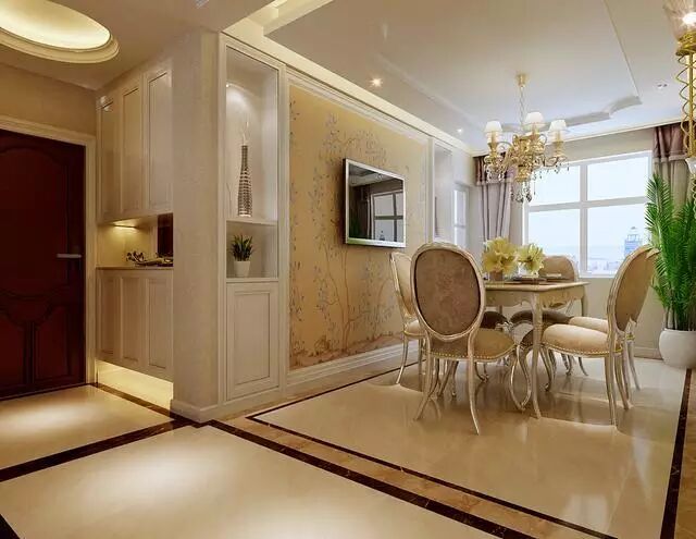 这选择了简欧风格的设计,总体定位轻奢,舒适。大气的吊顶设计,华丽的欧式家具,提高着整个居室的档次。入户门的柜子可以放鞋子,进门就可以把包,钥匙等物品放在这里,很方便。电视背景墙是印花壁纸,清新有质感。
