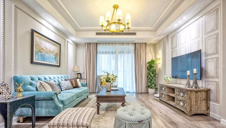 主卧的色彩搭配的非常的小清新,以浅蓝色为主的墙面、软装搭配美式的家具,很好的缓解了美式风的厚重感。