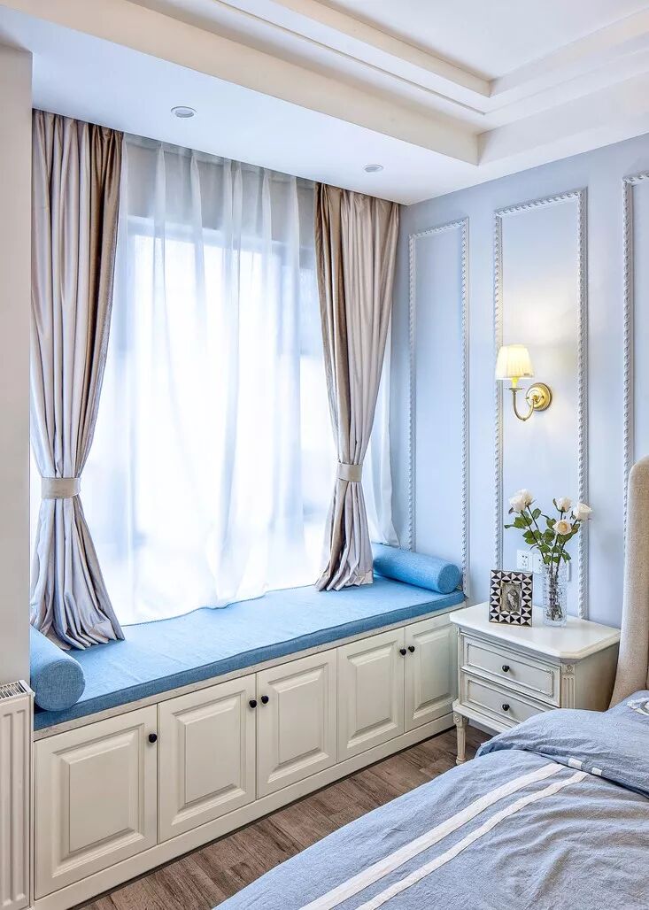 主卧里还有一个实用又美观的飘窗,我们在设计飘窗的时候,搭配好窗帘、纱帘和坐垫,也可以让自己家的飘窗这么美~