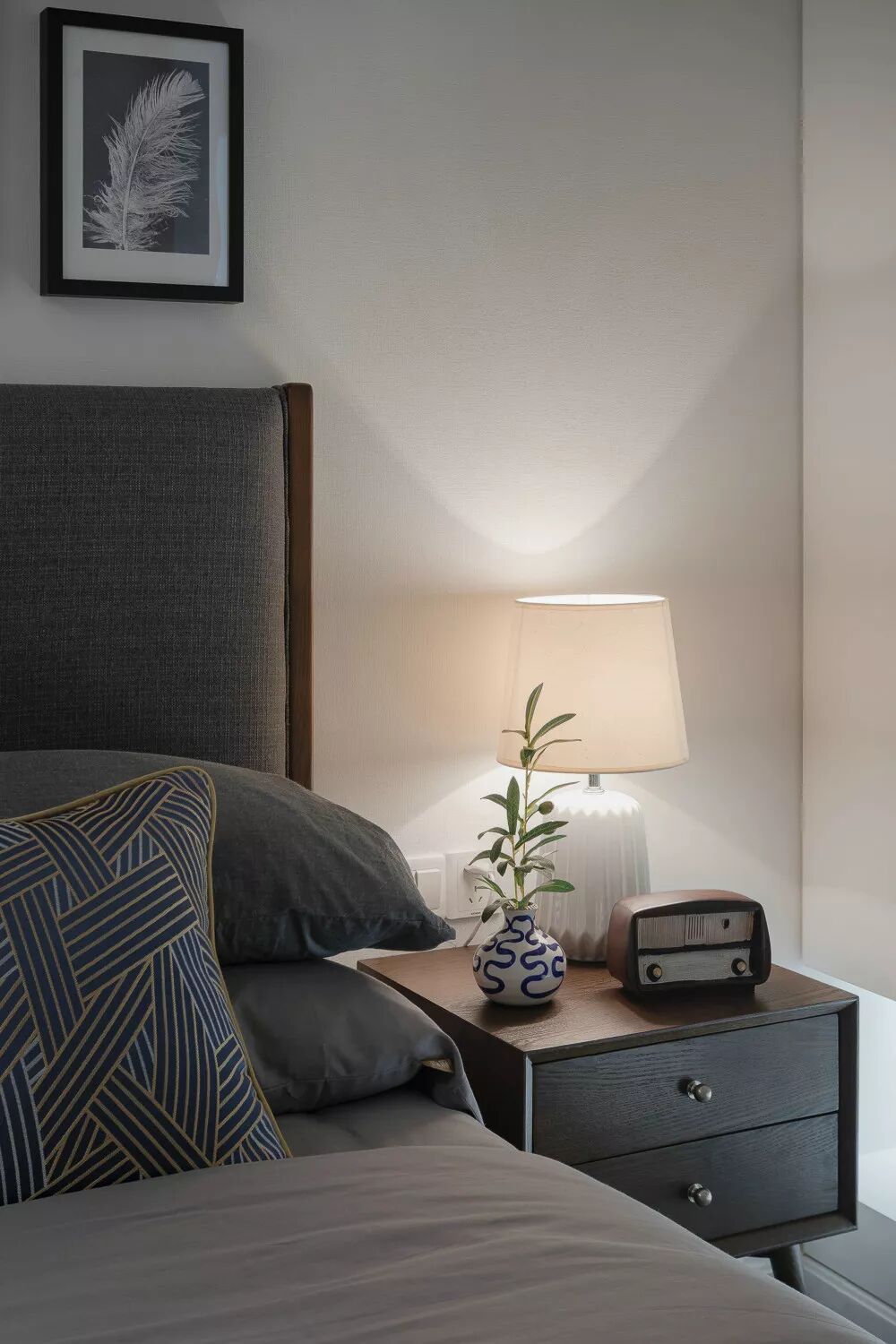 主卧清新素雅的床铺和床头背景墙,让空间中缓缓流出清澈的光。