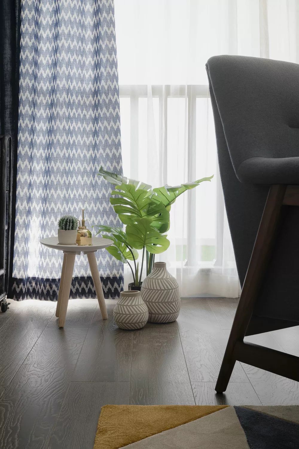灰色的布艺沙发,搭配高矮的实木茶几,金色花瓶里蓬勃生长的绿植,温馨惬意的待客空间被勾勒出来,几何的地毯和同样元素的抱枕,个性十足。