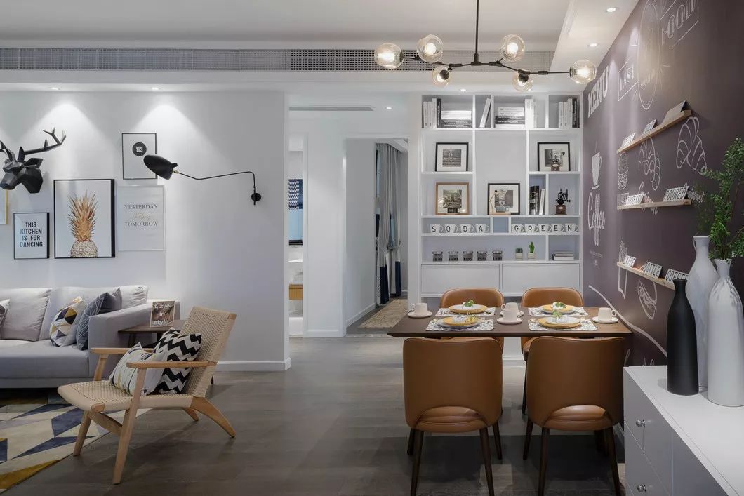 沙发背景墙上的黑色麋鹿头是客厅的一大亮点,搭配白色的墙面,就像穿行在北欧迷雾丛林里的小鹿走出了森林,看见了蓝天白云。
