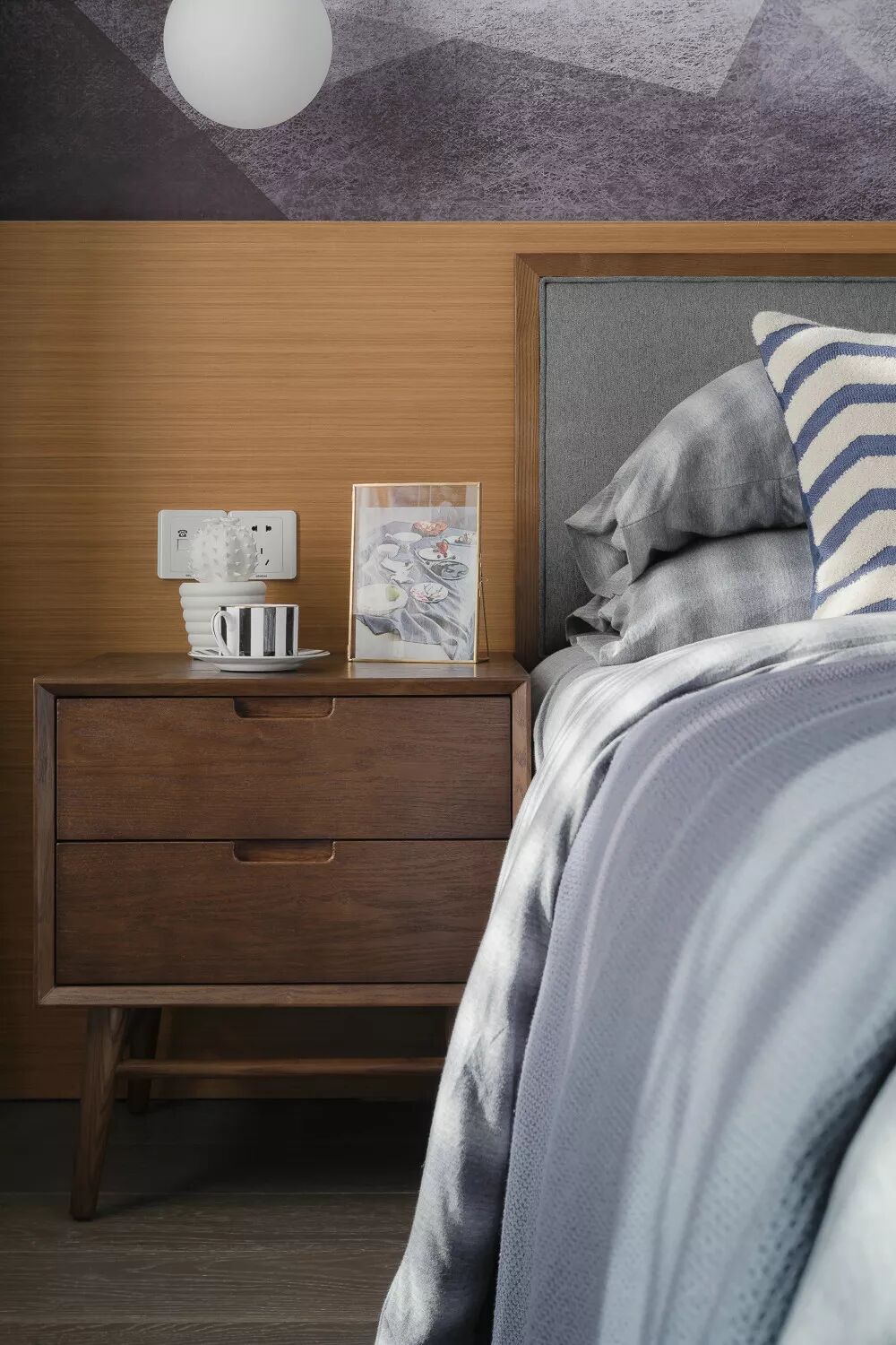 原木地板,搭配实木床头柜,把高质感展现出来。