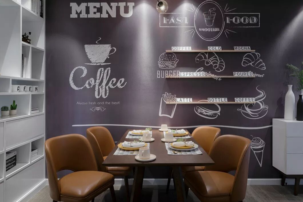 餐厅的墙面采用了北欧风的黑板墙+墙绘来装饰,小隔板把各种食物的名称用英文标出来,白、紫、棕,色彩的搭配,让餐厅的氛围变得活泼欢快。