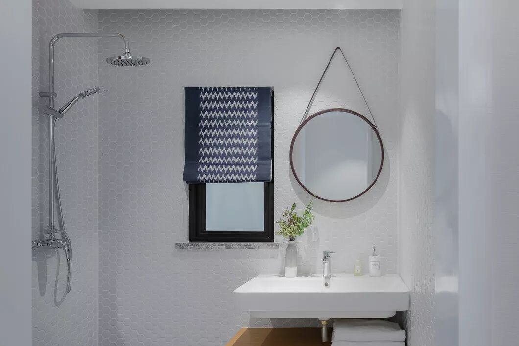 洁白的空间里搭配时尚的皮带圆形挂镜,文艺清新,优雅美观。