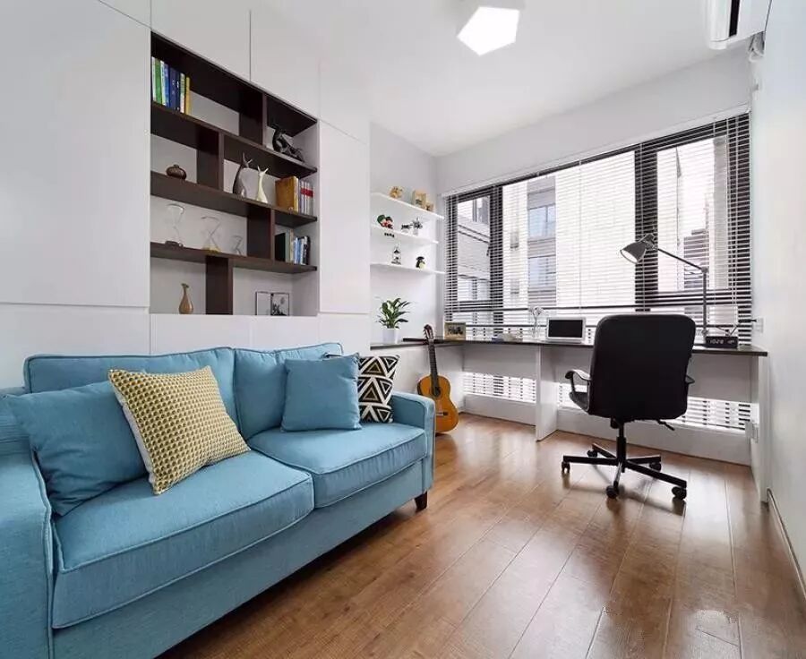 独立的书房,里面还摆了一张淡蓝色的布艺沙发,在工作看书累了的时候,就可以坐在这上面休闲放松一下。