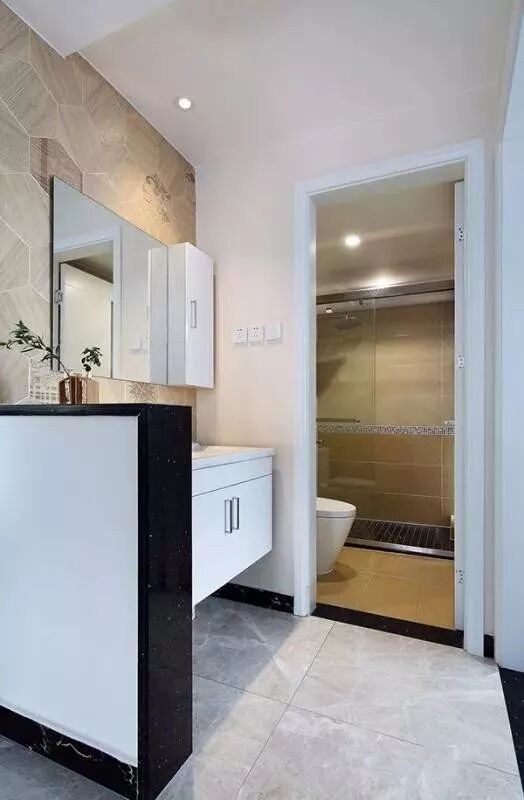 卫生间干湿分离的格局,把洗手盆设在卫生间门外,同时以一睹矮墙为隔断,让卫生间的兼容功能更加强大。
