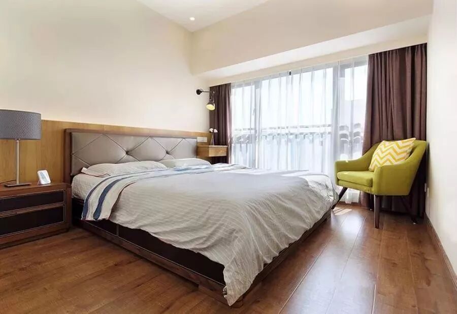 卧室空间总体比较温馨的格调,暖色的地板与软装搭配,营造出一个稳重而端庄的休息空间,让人置身其中感受着满满的轻松与舒适。