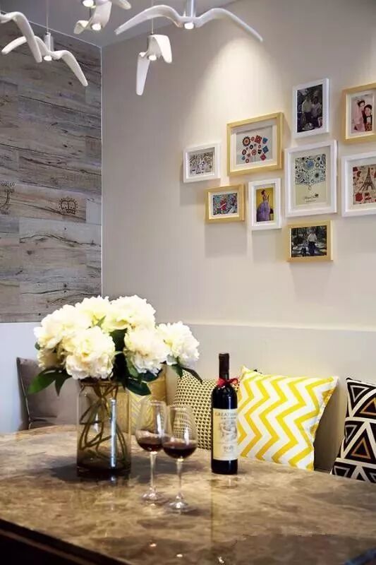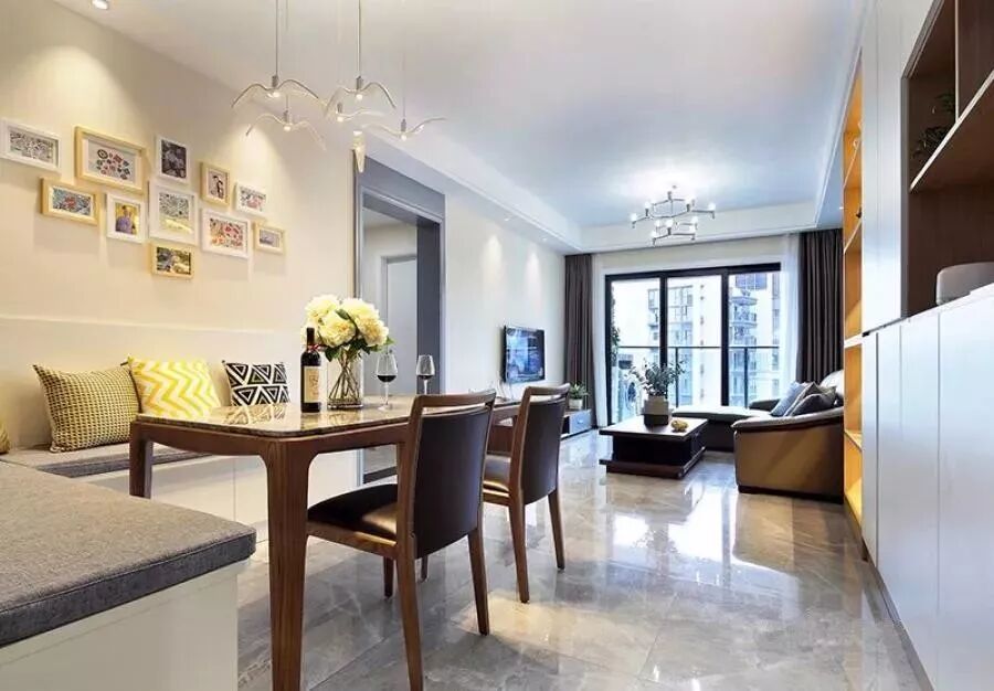 户型面积不大,所以把餐厅与客厅保存在同一个空间内,吊顶与地面墙面都保持了比较统一的格调。L型卡座式的座椅,搭配一套小餐桌椅,还有背景墙一幅照片墙,整体显得格外的优雅端庄。