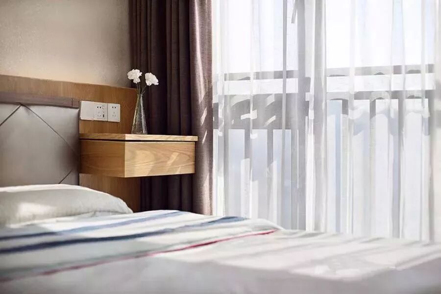 悬空式的床头柜,与床头位置的那款护墙板搭配得时尚而美观大方。