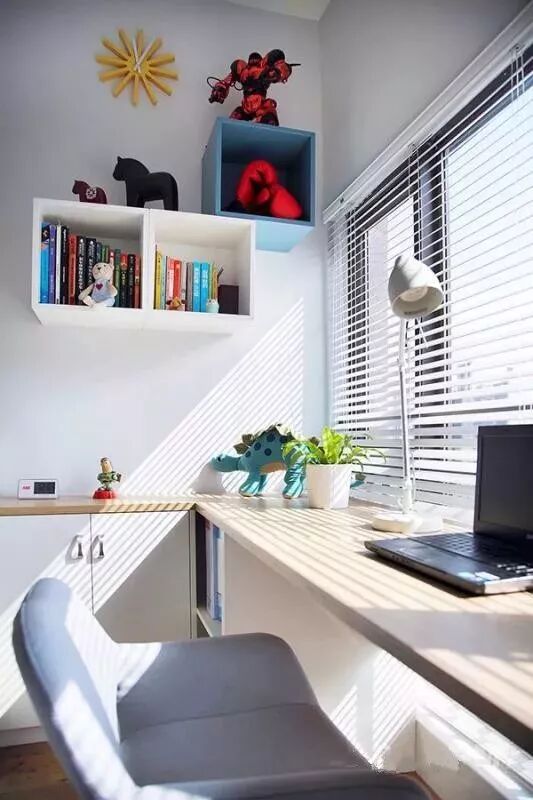 在靠窗的位置,还设置了一张书桌,结合百叶窗的光影,为主人带来了一个明亮而舒心的阅读工作空间。