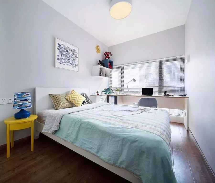 次卧空间较为北欧文艺范的空间感,清新的软装与色调,充满了自然舒适的氛围感。