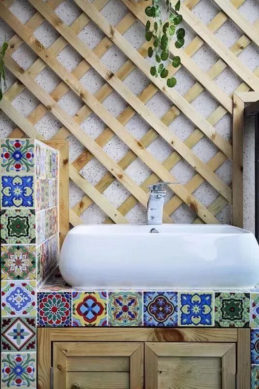 阳台的花砖洗手盆,还有后方的花架,把阳台装得格外的自然惬意。
