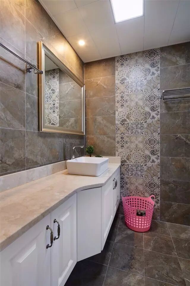 卫生间地面墙面以水泥质感的工业风砖,结合一排花砖,显得更是大胆年轻的复古风气息;