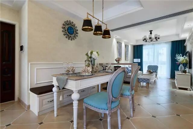 玄关旁边的就是餐厅,小美式的卡座与餐桌椅,整体显得小巧而又高档;