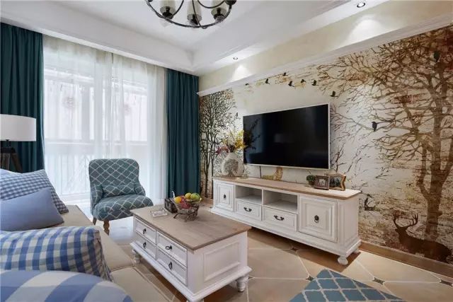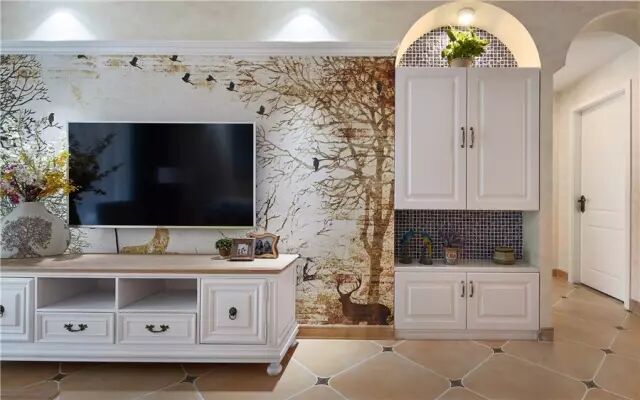 电视墙更是以独特大胆的树枝+动物图案的壁纸,看上去犹如置身森林般的舒适轻松;看着这个电视墙,相信你也会有一种陷进去的感觉,好像自己是在深林之间;