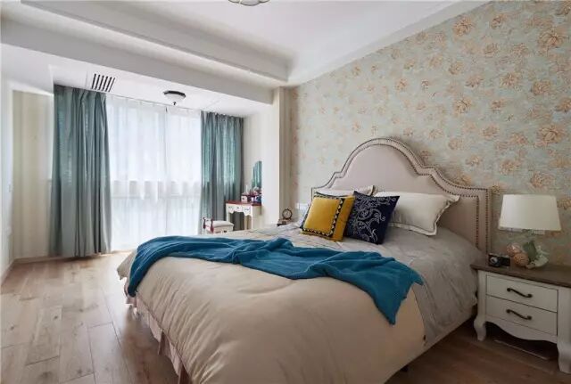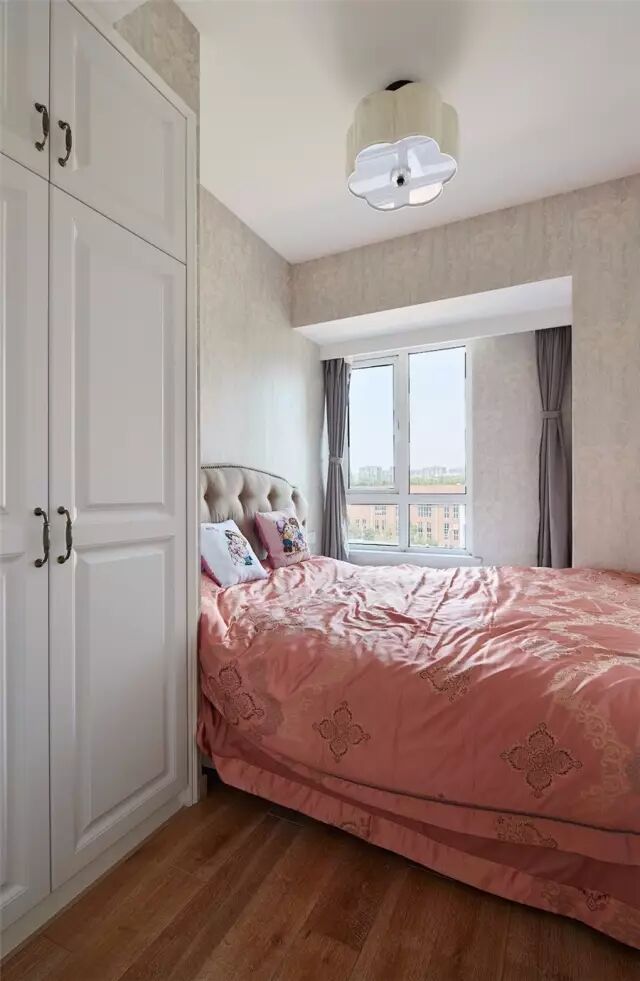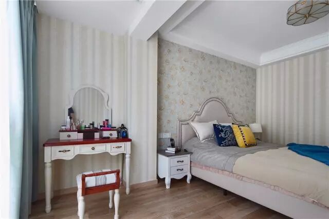 主卧把阳台打通,在靠窗位置摆上一张小化妆台;而在卧室背景墙位置则是贴上玫瑰花图案的壁纸,搭配上现代欧式的床,显得浪漫优雅又精致;