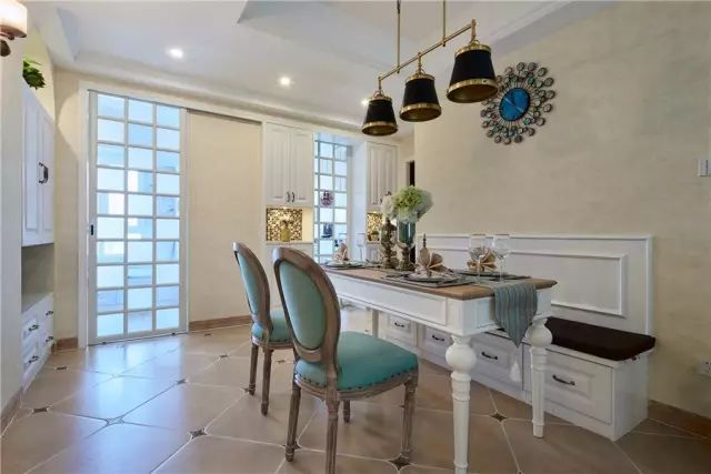 整个地面都采用复古砖铺贴,结合两张复古调的餐椅,整体显得充满了精致的艺术气息;