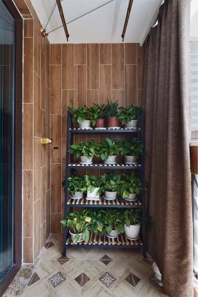 阳台的墙面贴着仿木纹的墙砖,而地面则是复古范的地砖,靠墙摆上一个植物架,摆满绿植显得清新自然舒适;