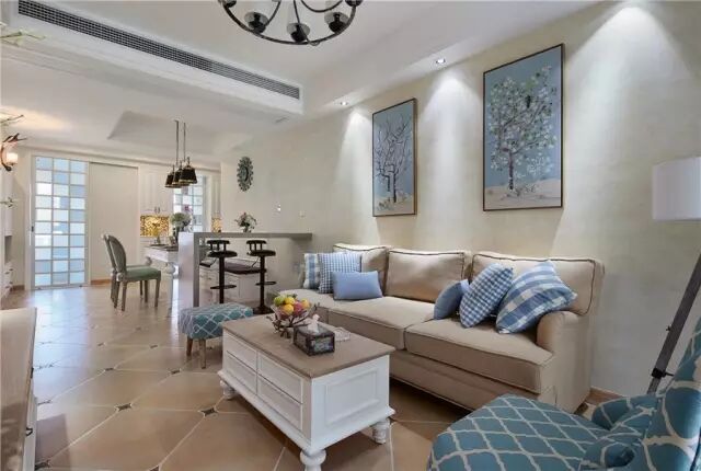 客餐厅中间装了个吧台隔断,一套浅色的现代美式布艺沙发,与茶几的色调相互衬托呼应,效果简单精致又高档;
