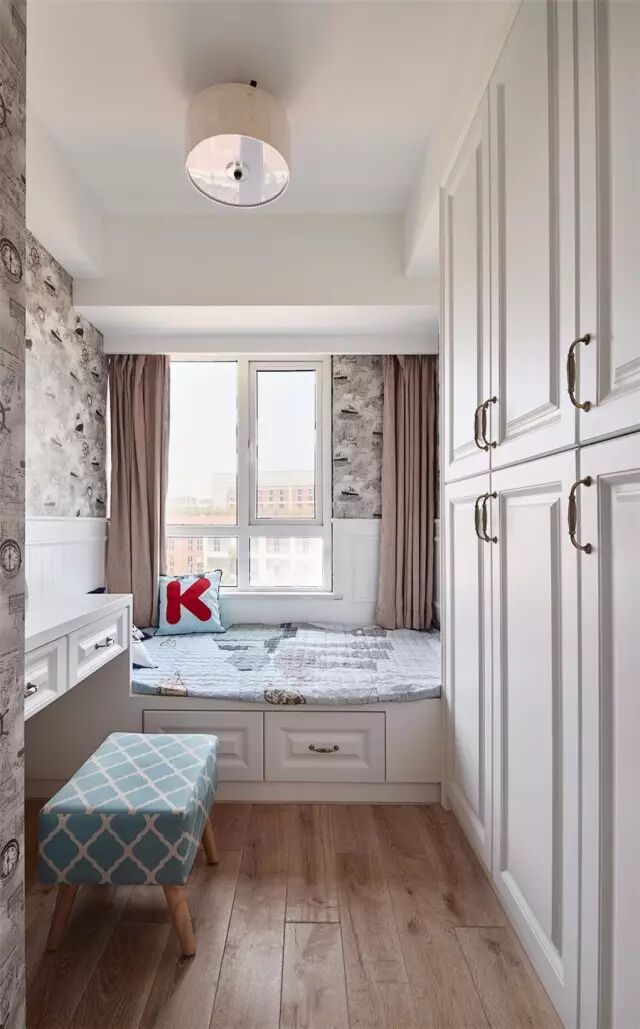 次卧的面积比较紧凑,在靠窗位置摆一张小床,同时衣柜嵌入到墙面与天花的梁巧妙地结合起来;