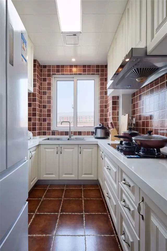 厨房U字形的布局,小巧而又实用的布局,在暖色墙面地砖的搭配下,呈现出一个惬意舒适的空间氛围;