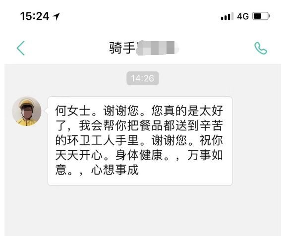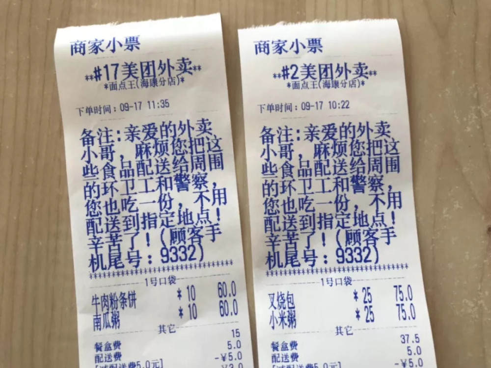 “亲爱的外卖小哥,麻烦您把这些食品配送给周围的环卫工和警察,不用送到指定地点!辛苦了!”顾客名称都统一写的是“何女士”。经过一番周折,记者终于找到了这位好心人,原来她是盐田区外国语小学的一名语文