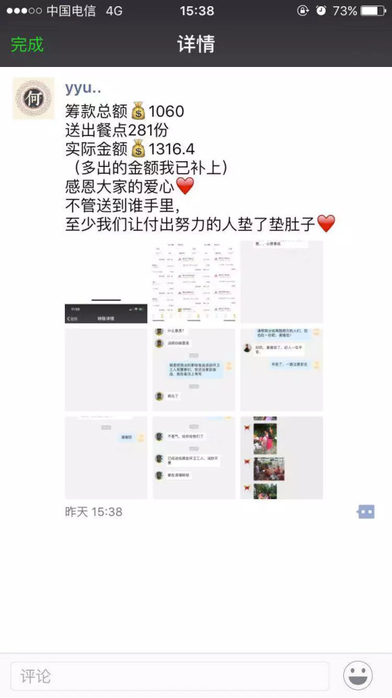 何老师告诉记者,昨天学校停课,她自己一人呆在家中。由于自己没有“囤粮”,于是中午她就给自己点了个外卖。点完之后,她突然想到外面正在清理、救援的人们肯定更需要一份食物。于是她又点了20份外卖,并且在朋友圈中发动好友一起加入这一善行,于是就有了这一张张暖心的订单。<“何佳瑜 盐田区外国语小学老师:有我的朋友,有我的家人,也有家长。他们都不同程度地给了一些金额,有六十多人是给了10块钱的,还有是给一百的,给两百的都有,总共捐了1060块钱,然后一共点了1300多块钱,差价我自己补上去的。”