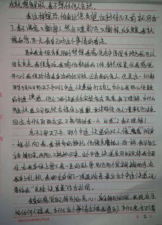 教练的工作,虽然很累,但我感觉开心!我很珍惜身边的好朋友,还有我的家人,但这一切都因为9月14日那天下午叫了中通快递给打破了。为什么我那么信赖的中通快递,他们的快递员会突然变成恶鬼,我不理解,为什么中通快递公司既然在媒体上道歉,承诺赔偿,他们的董事长也出来回应,为什么到现在还不能够给我一个“公道”?我不理解!
