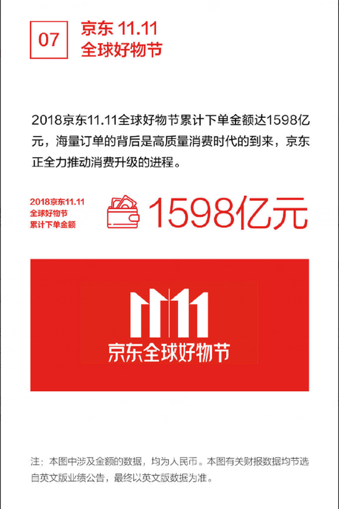 另外,刚过去的双11购物节,京东官方给出的数据显示,自2018年11月1日00:00起至11月11日24:00,京东11.11全球好物节累计下单金额达到了1598亿元,创造了新的记录。