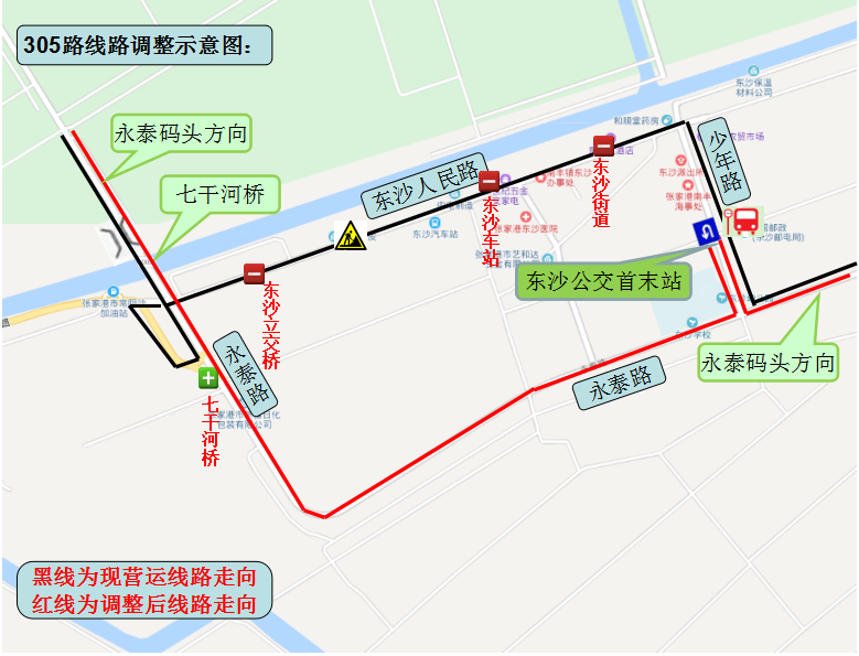 305路㈠调整前线路走向:永泰码头—永泰路—少年路—东沙人民路—七干河桥西侧下穿辅道—永泰路—按原线路—永泰码头;㈡调整后线路走向:永泰码头—永泰路—少年路—东沙公交首末站站内掉头—少年路—永泰路—按原线路—永泰码头;三、临时撤销:东沙人民路上东沙街道、东沙车站、东沙立交桥站点;四、临时增设:永泰路上七干河桥站点。