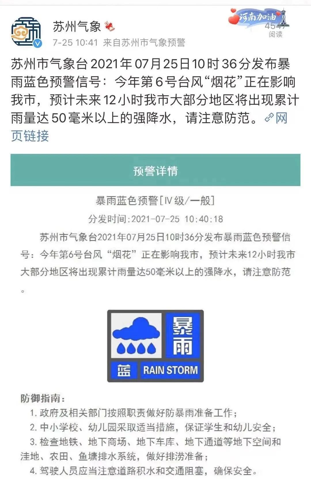 苏州市气象台今天10时36分发布暴雨蓝色预警