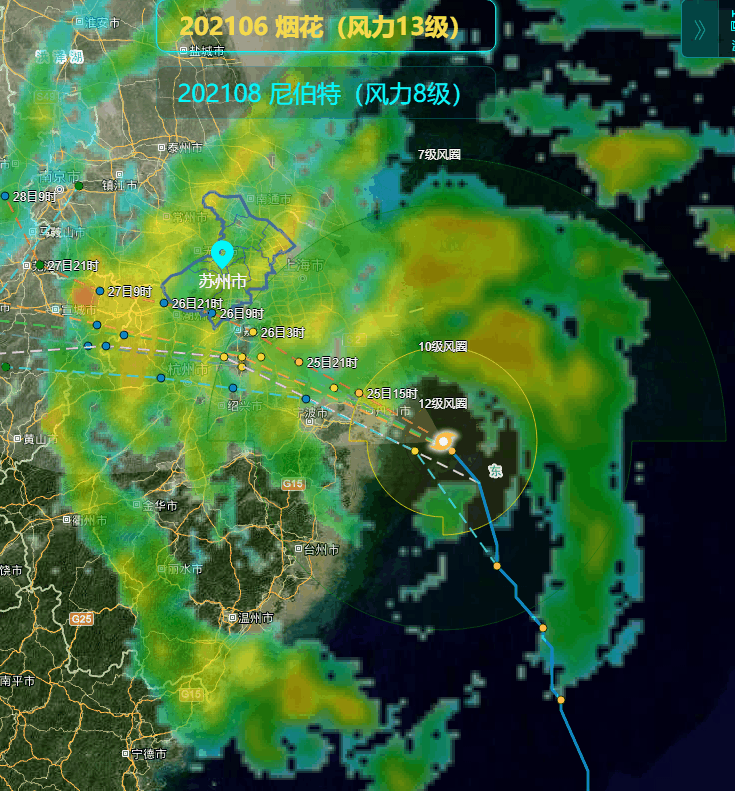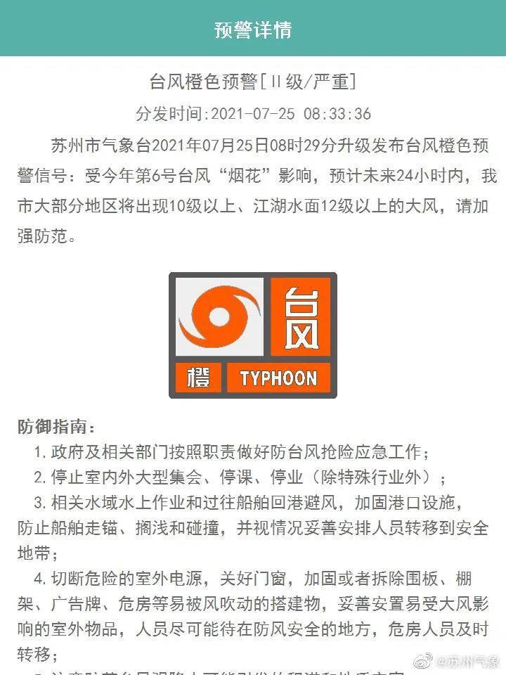 苏州市气象台2021年7月25日8时29分升级发布台风橙色预警信号:受今年第6号台风“烟花”影响,预计未来24小时内,我市大部分地区将出现10级以上、江湖水面12级以上的大风。