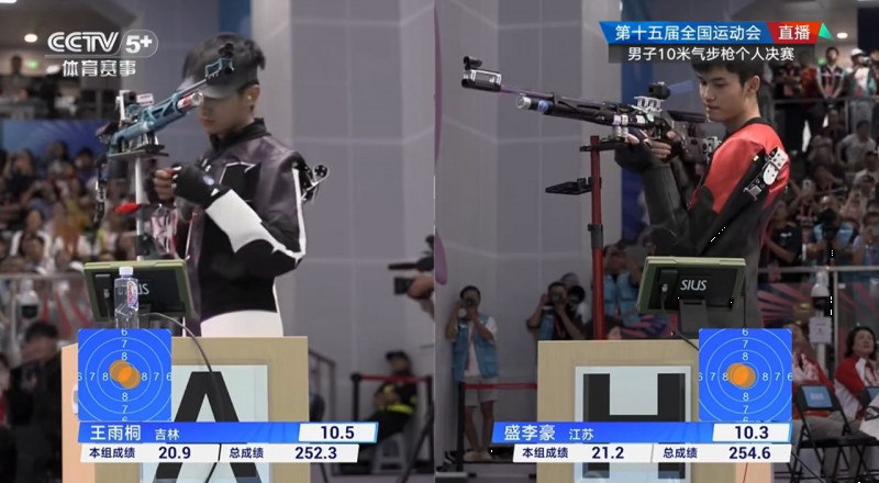今天 在第十五届全运会 男子10米气步枪决赛中 张家港健儿盛李豪 打出254.6环 以2.3环的优势夺冠 王雨桐和刘宇坤分获银牌和铜牌