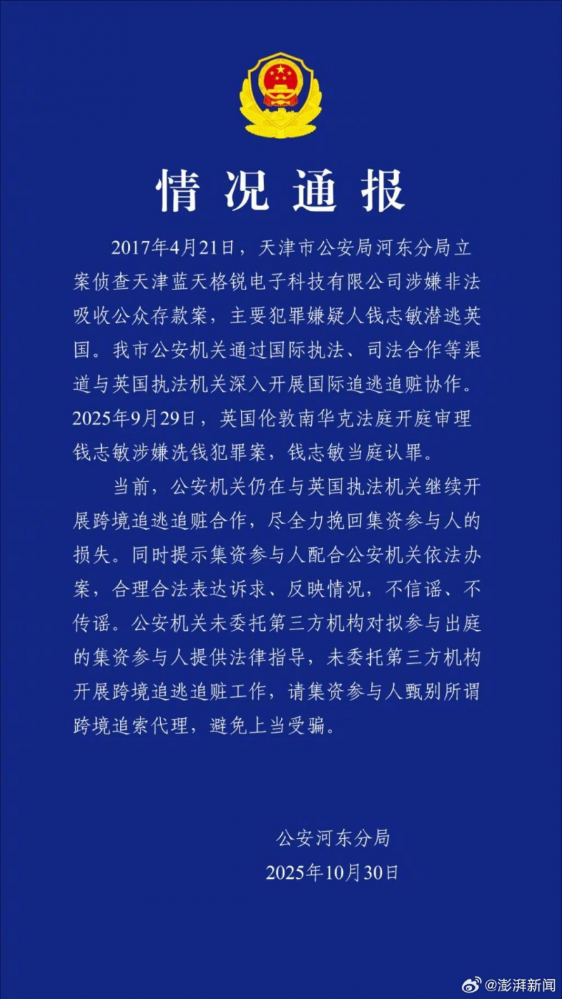 钱志敏在英当庭认罪承认洗钱,天津警方通报:继续开展跨境追逃追赃
