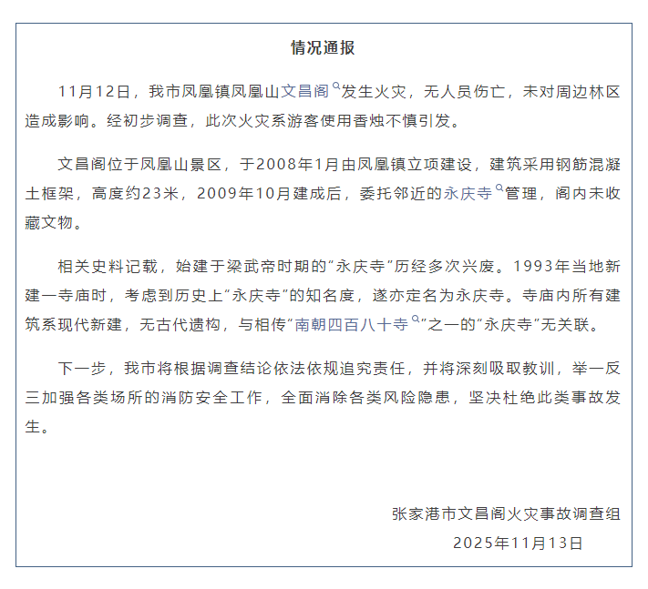 张家港通报“文昌阁火灾”:系游客使用香 ..