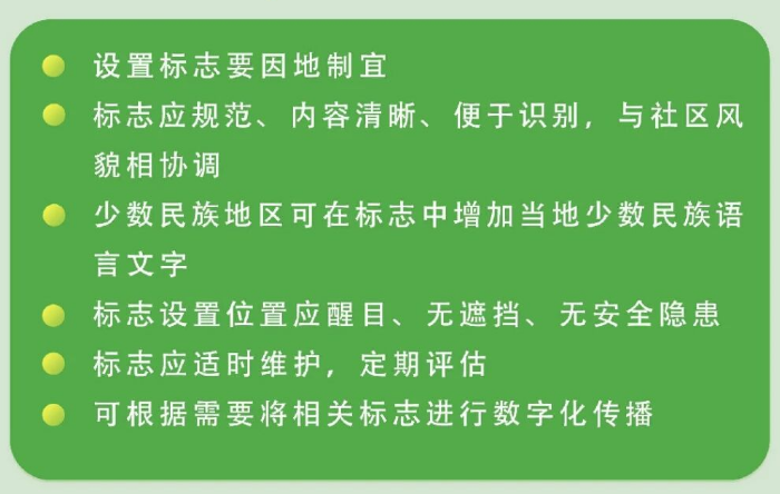 标志在使用时,除了有图形,还会配合相应文字,说明标志的内容。此外,少数民族地区可视情况在标志中增加当地少数民族语言文字,确保居民能看懂。