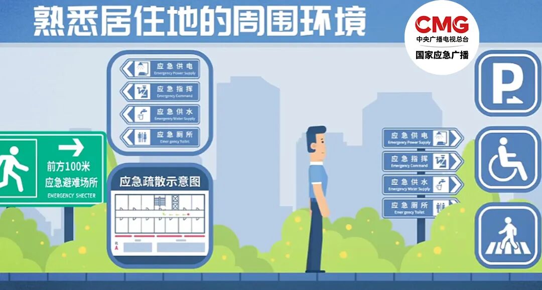 1. 熟悉居住地周围环境,出门散步时,多留意社区减灾标志、应急疏散路线、避难场所的出入口等。去外地出差、旅游时,也应提前留意当地应急避难场所的位置和路线。