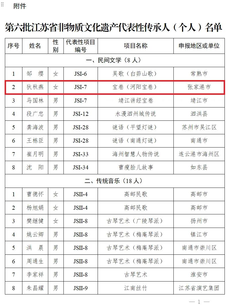 近日,江苏省文化和旅游厅正式公布第六批省级非物质文化遗产代表性传承人名单,由张家港市凤凰镇人民政府推荐的宝卷(河阳宝卷)传承人狄秋燕成功入选。